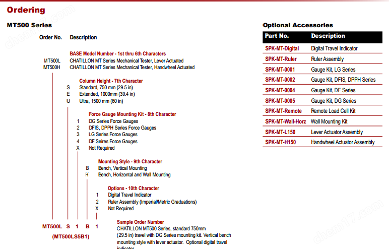 MT500力学测试仪Chatillon®MT500系列机械试验台测力应用到500磅(2.5千牛)是一个易于使用的解决方案的能力。这个试验台可配备快速行动杠杆或精密控制十字头速度和行程手轮。mt500试验台可台安装的,安装的,墙壁安装或水平安装。垂直间隙可从750毫米(29.5英寸)高达1500毫米(60英寸)。标准行程为6英寸(150毫米),虽然更长的行程可以容纳作为一种特殊的秩序。
