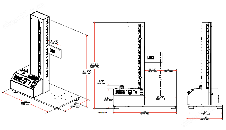 Deflection limit switches are supplied on the front of the column. The column contains increments in inches and millimeters for positioning the limit switches and for measuring sample deflection. Position and “lock-in” a High and Low deflection limit to protect your gauge from overload conditions or for ending your test at a distance traveled. The crosshead travels up to 15-inches (380mm).